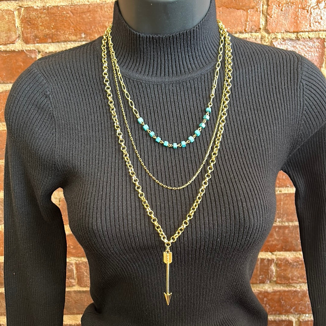 3 Strand Faux Gold Chain with Turquoise & Arrow Necklace