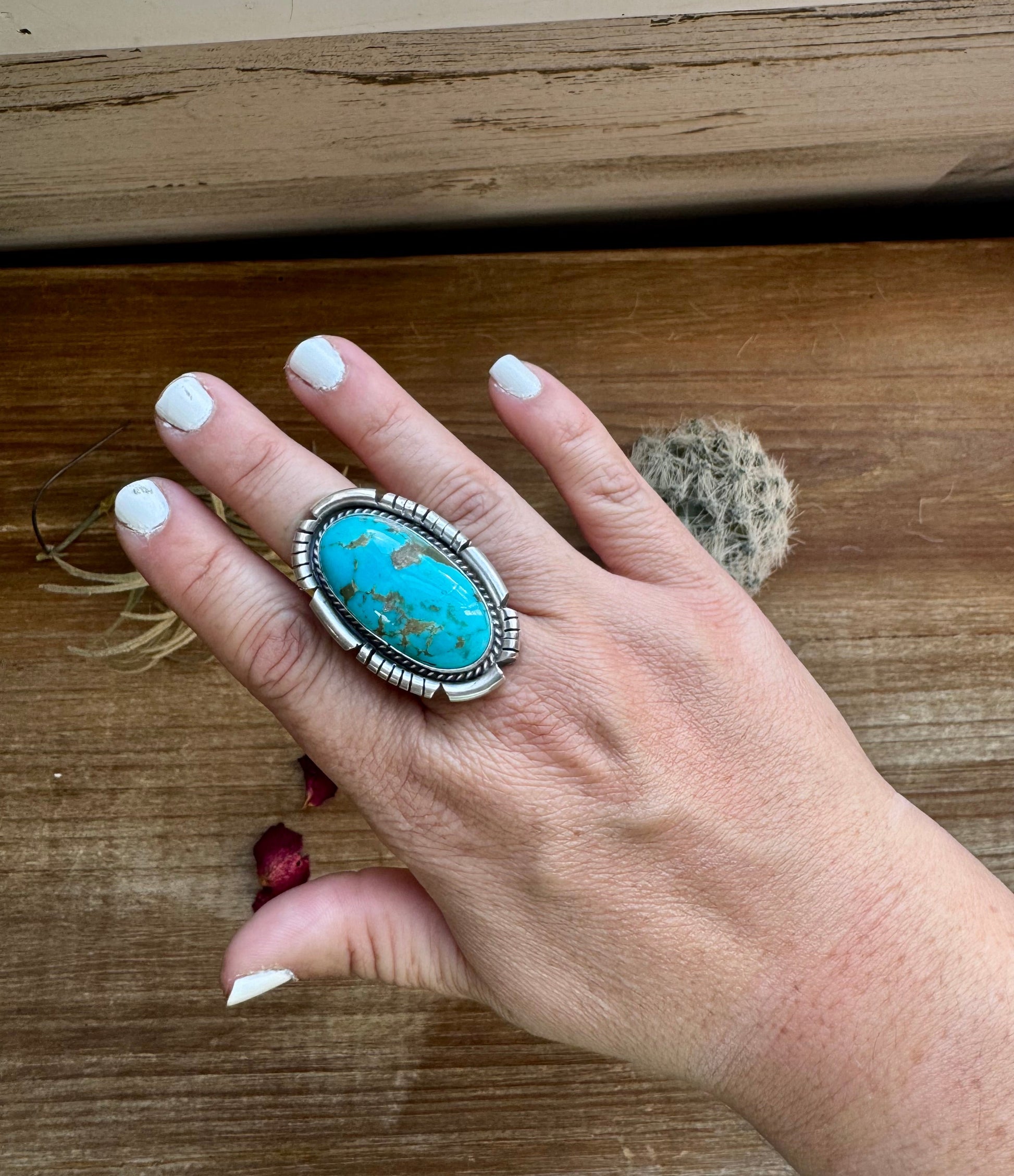 Big oval Ring- adjustable- Kingman turquoise ring and sterling silver