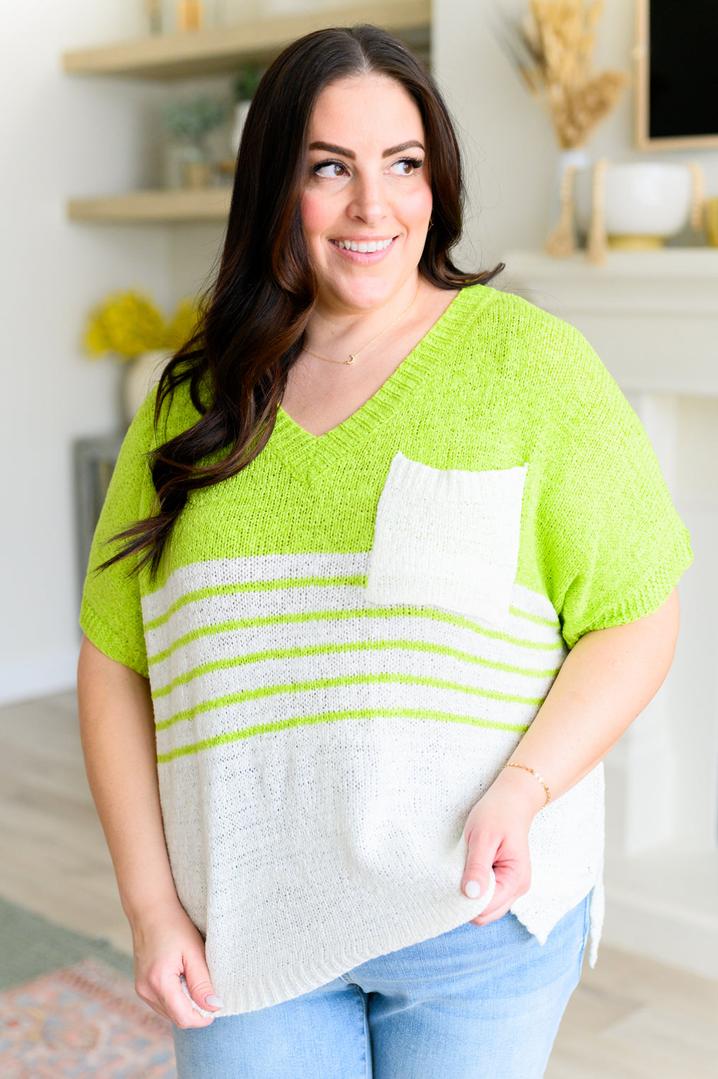 The Speak Now V-Neck Top is perfect for any occasion. Its lightweight knit offers comfort and style, while the variegated stripe adds a touch of uniqueness. The v-neckline and dolman sleeves provide a flattering fit, and the patch pocket adds functionality. Elevate your wardrobe with this must-have piece.