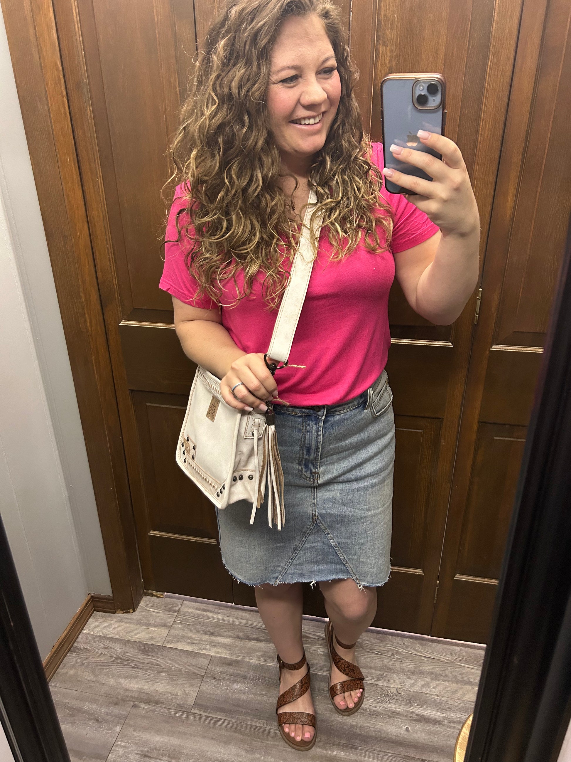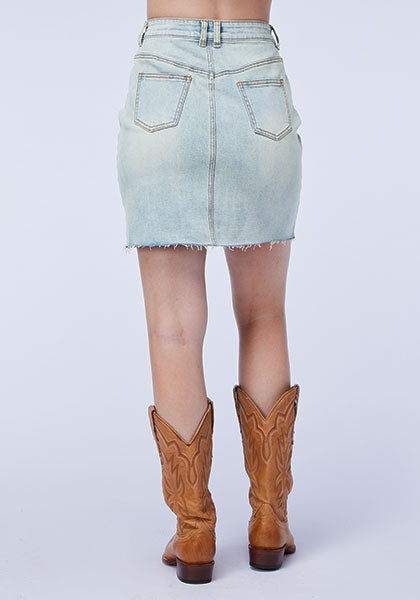 Women's Bottom Weight Denim 5 Pocket Skirt * Raw Edge Hem * V Shaped Inset At Center Front * Single Point Back Pockets * Garment Washed For Softness