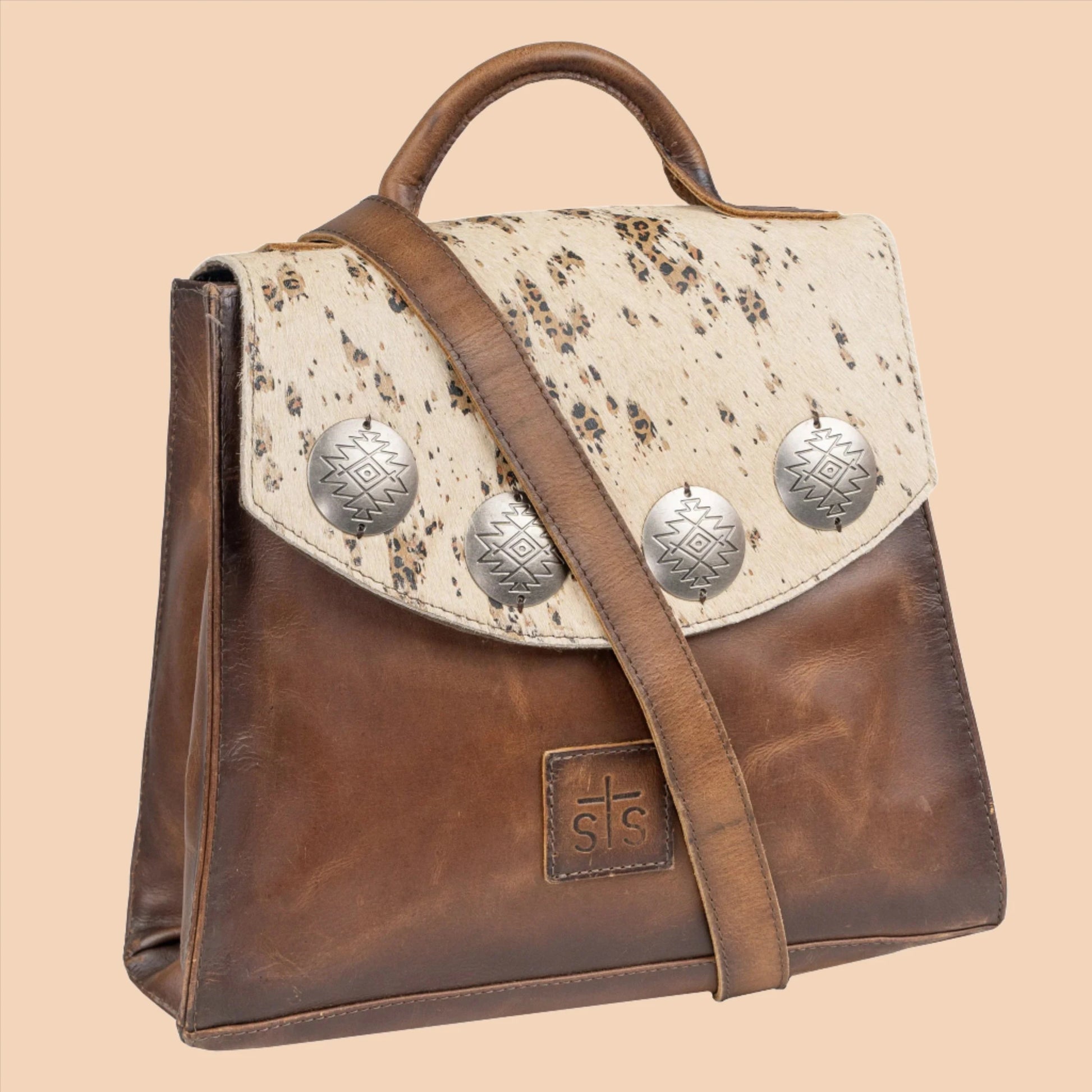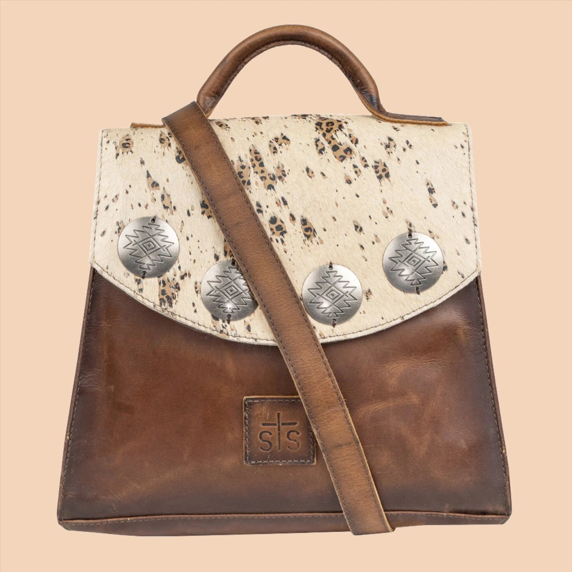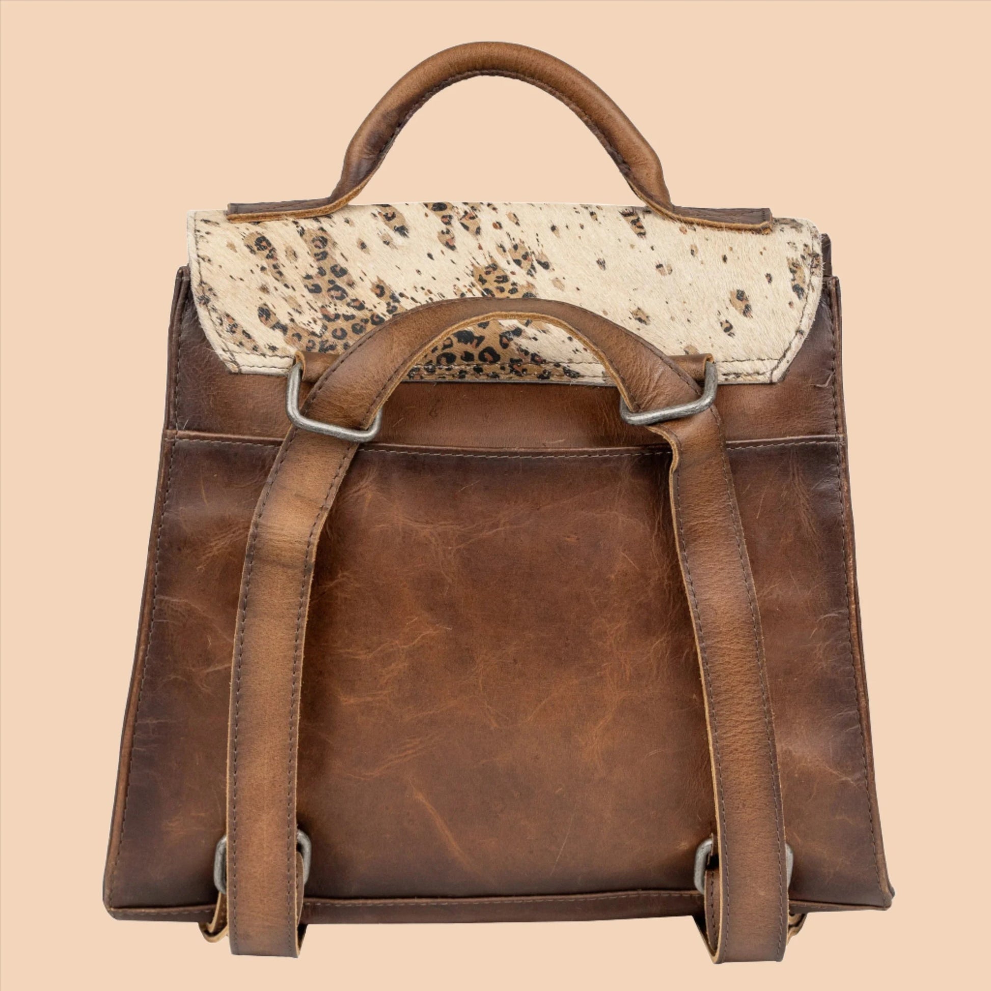 The Serengeti Remi Backpack features a unique baby leopard print scattered throughout hair-on-hide cowhide. Finished with a distressed full grain buckskin leather and large rustic conchos, this collection is a "must-have" of the season.