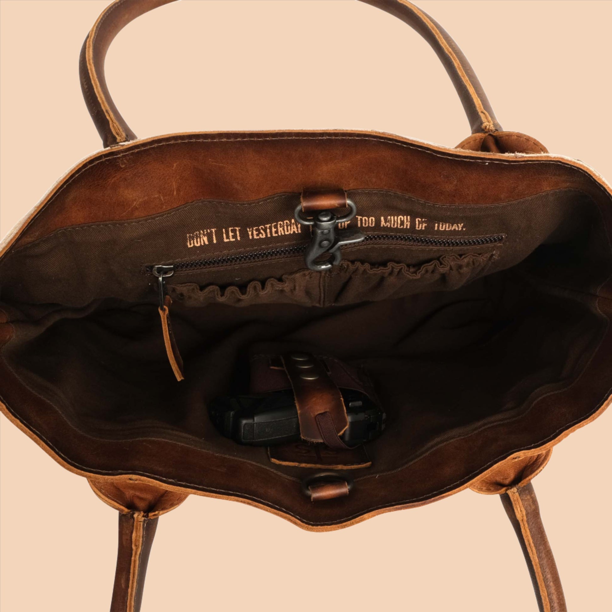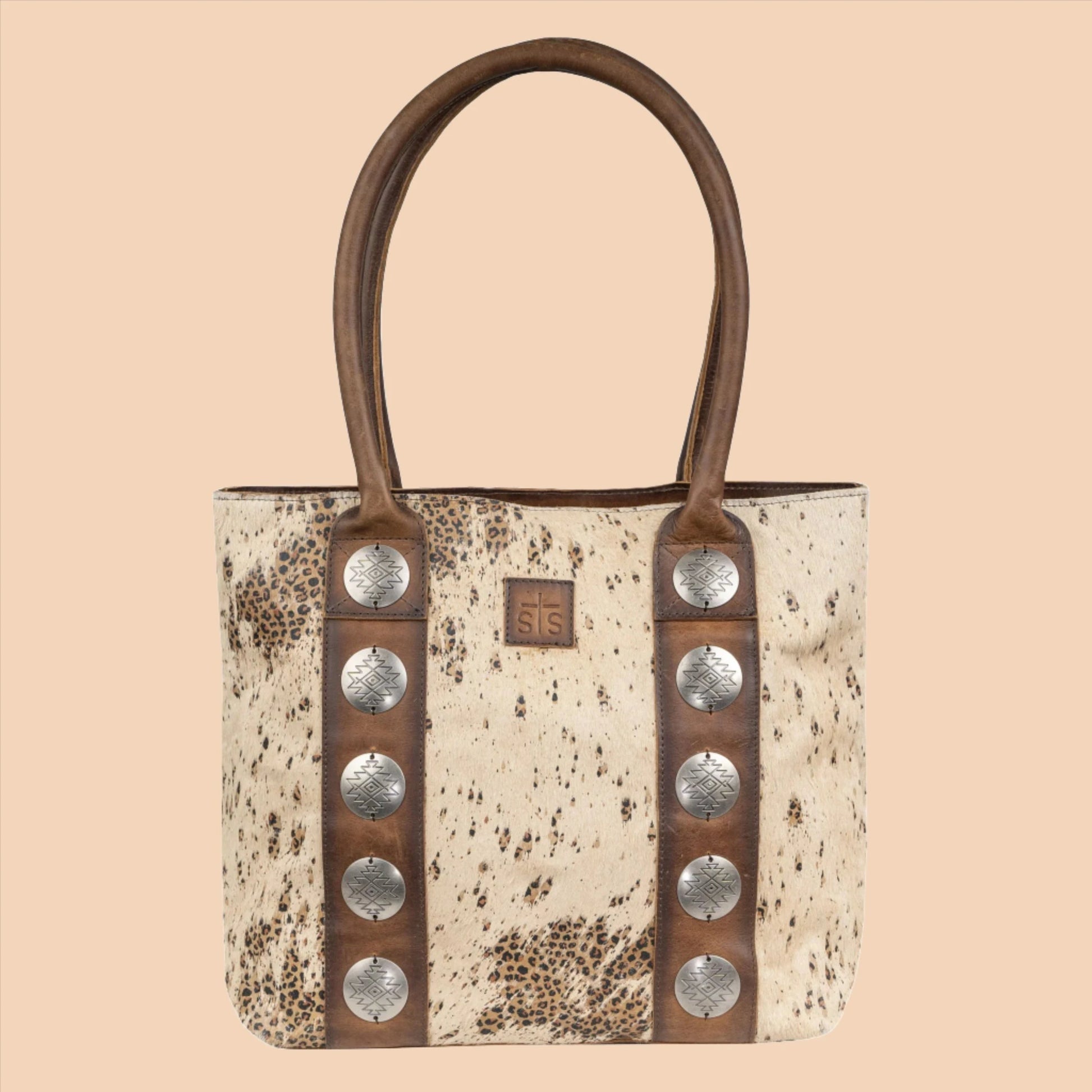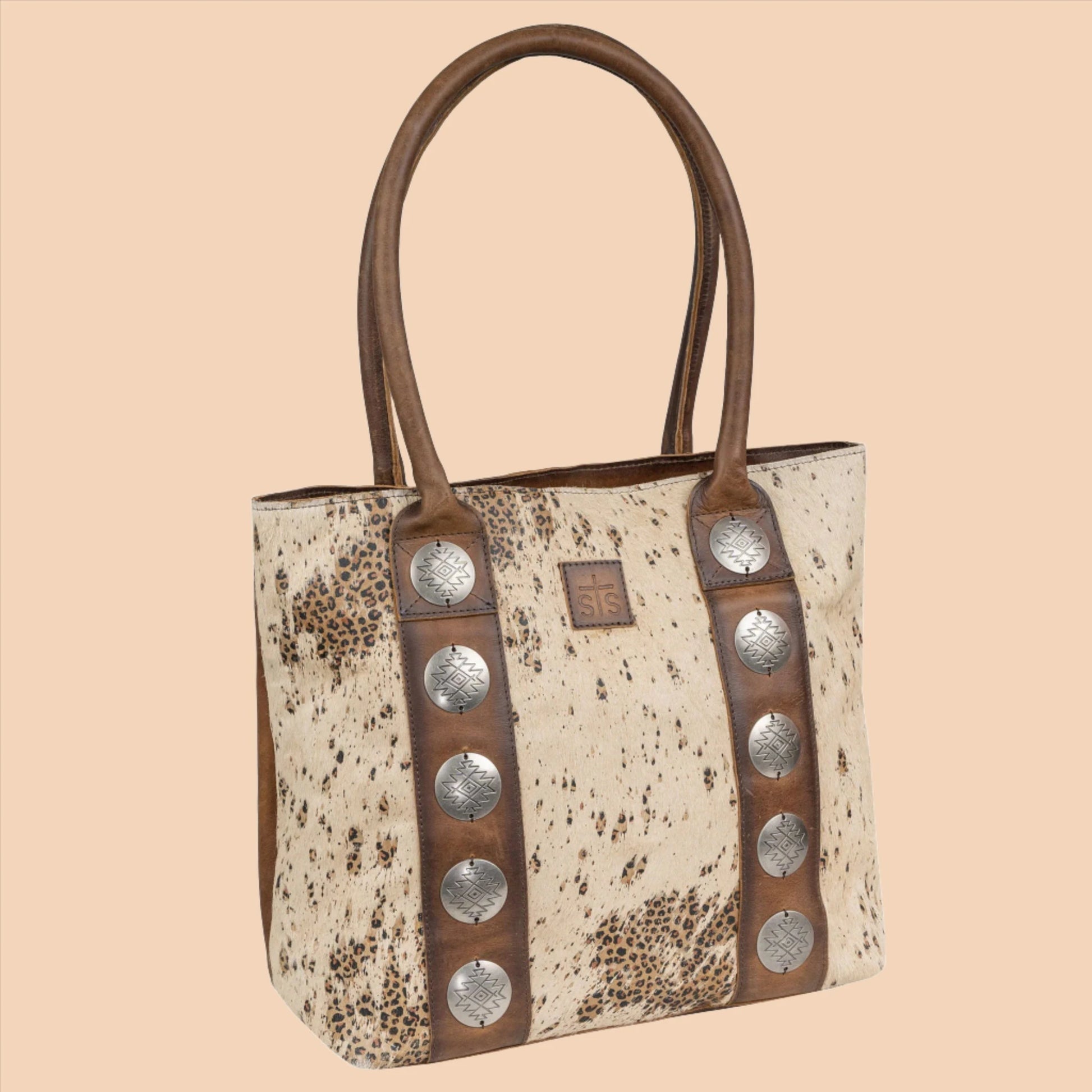 The Serengeti Tote features a unique baby leopard print scattered throughout hair-on-hide cowhide. Finished with a distressed full grain buckskin leather and large rustic conchos, this collection is a "must-have" of the season.