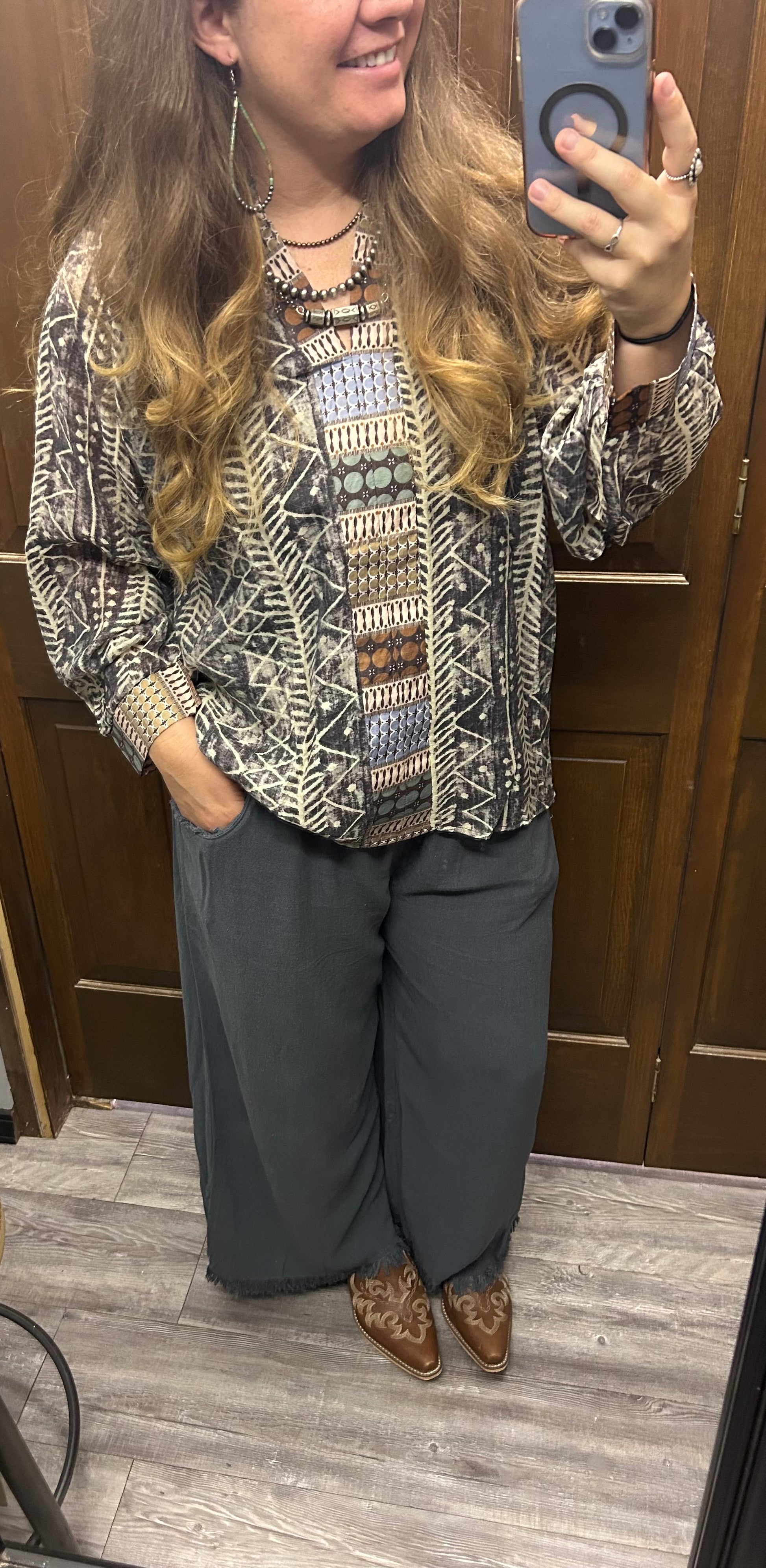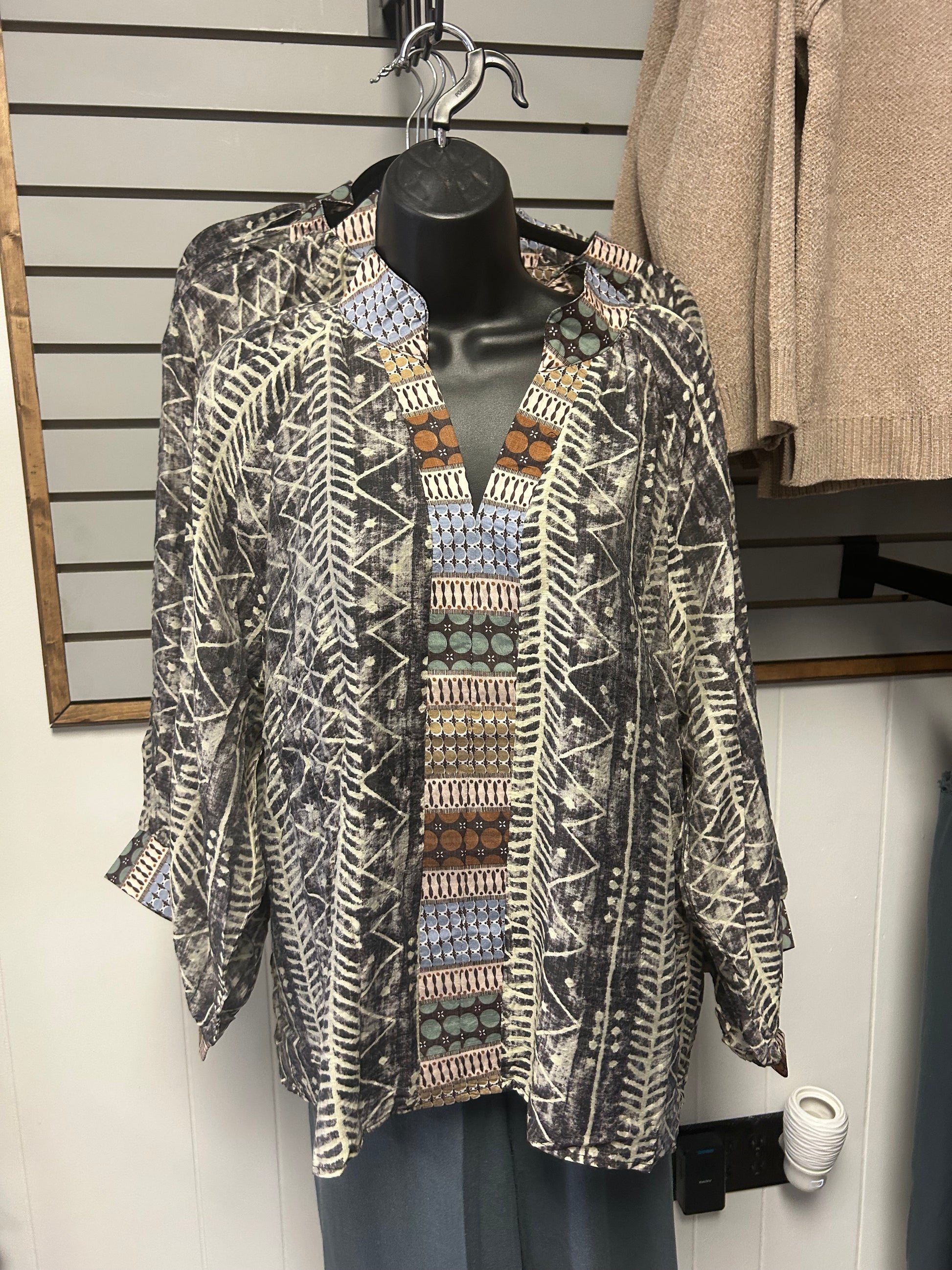 This top has the prettiest mix of neutral earth-tone prints that give it a soft western/tribal look. It has a relaxed fit with a lightweight feel, so it’s comfortable for all-day wear. The detailed patterning down the front adds a little extra interest without being too bold.