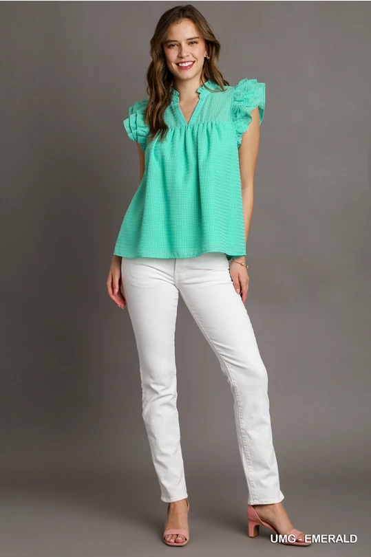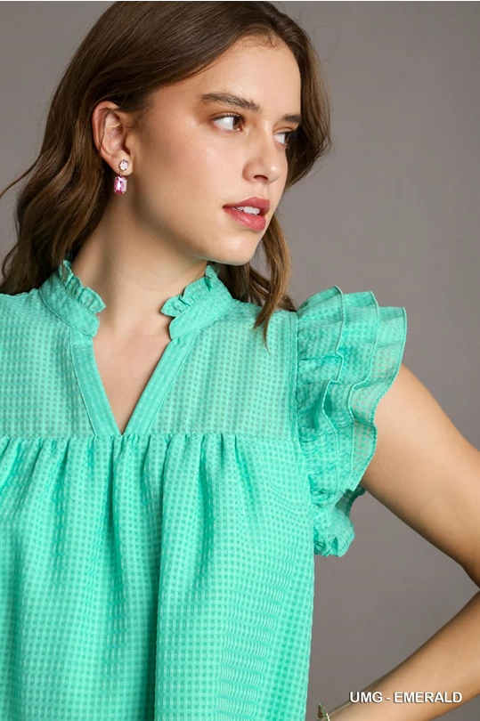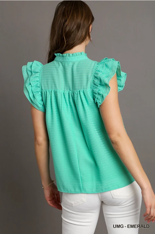Umgee Emerald Organza Layered Ruffle Sleeve Split Neck Top