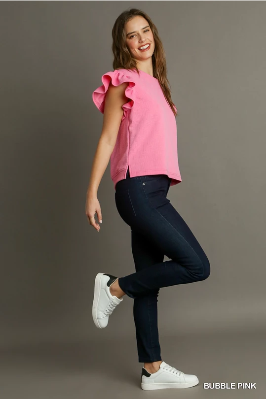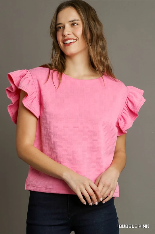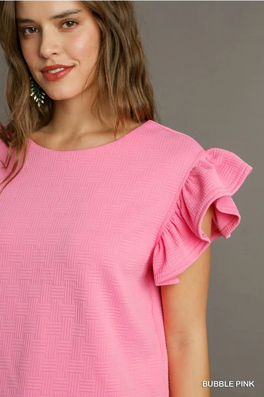 This Pink Boxy Cut Round Neck Criss Cross Jacquard Knit Ruffle Sleeve Top is a standout piece. Featuring a criss cross jacquard knit design, it adds texture and visual interest. The round neck and boxy cut provide a relaxed and comfortable fit, while the ruffle sleeves give it a feminine touch. Please note, it is not lined.