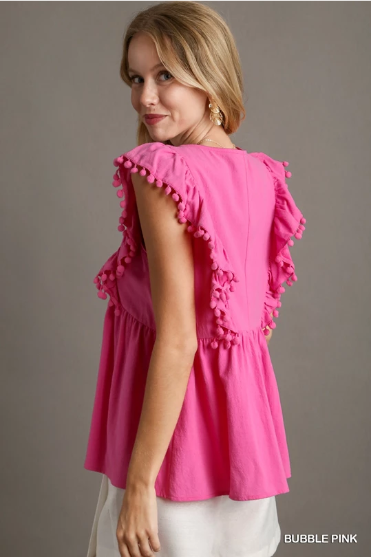 This charming top features beautiful floral embroidery that adds a touch of elegance. The playful pom pom details give it a fun and unique twist. With no lining, it's lightweight and perfect for layering or wearing on its own for a breezy, stylish look.