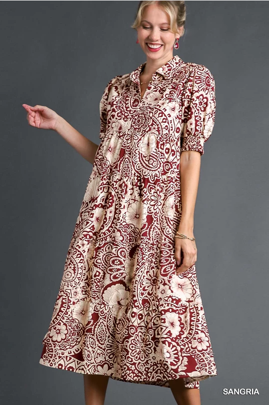 Umgee Sangria Paisley Print V-Neck Collared Tiered Dress